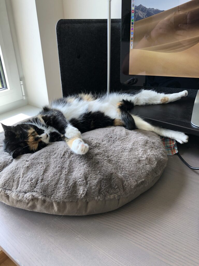 A favourite activity is leaving dead animals at the neighbour’s doorsteps. Why? It must be a warning. He also likes sleeping and the excessive licking of certain body parts during conf calls… We don’t want to go into any more detail about this.