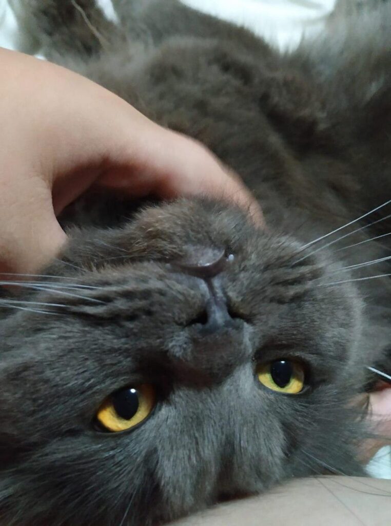 When we saw this beautiful British Blue kind-hearted boy, we immediately thought “Bingo, this is the cat we need!”. And so it became his name, Bingo. He is always in the mood for cuddles, but he’s still very independent. He always stands up for his fellow cats against the one and only enemy, At’Outa.