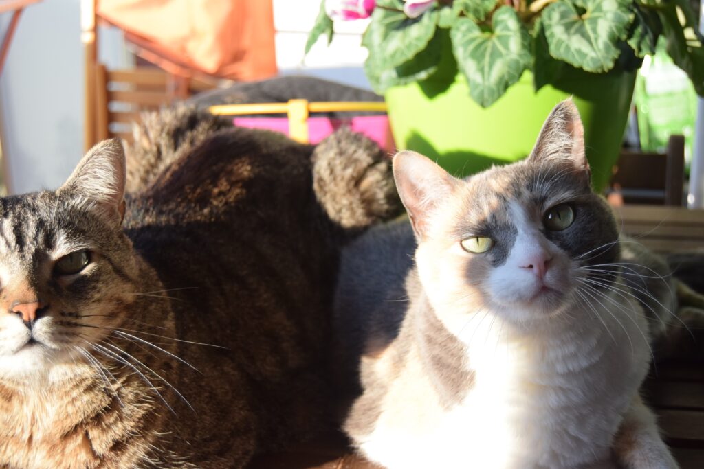 Koko (on the left) is – as you can see – a cat, but we think he wanted to be a dog. Koko is super friendly and loving, sometimes even a bit too much.